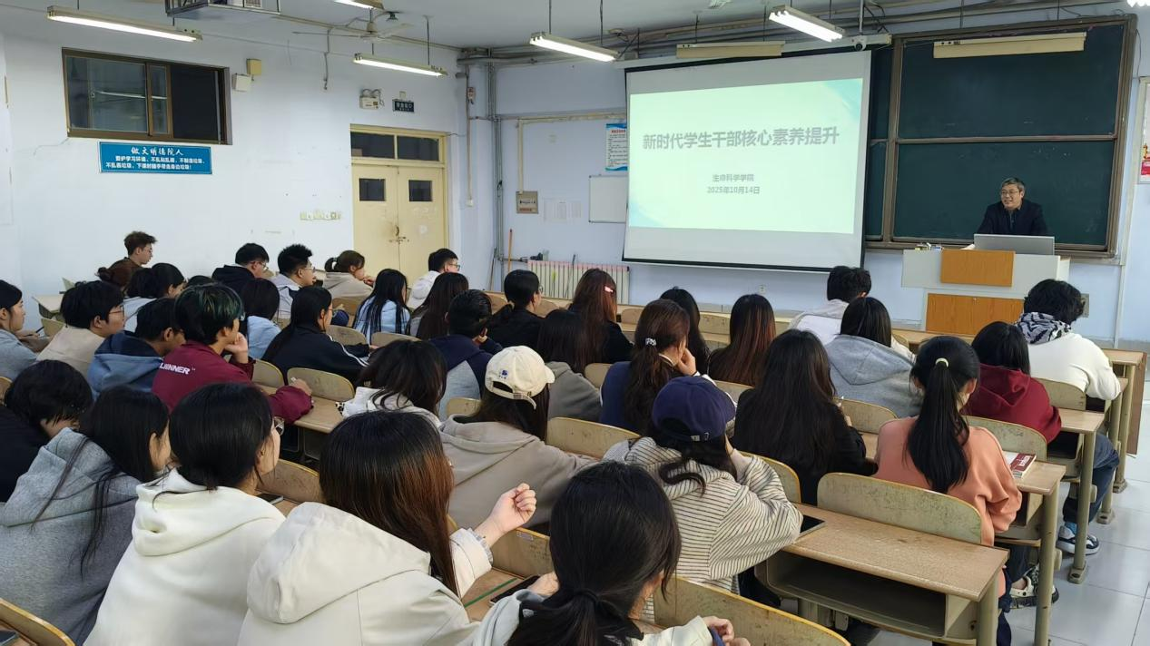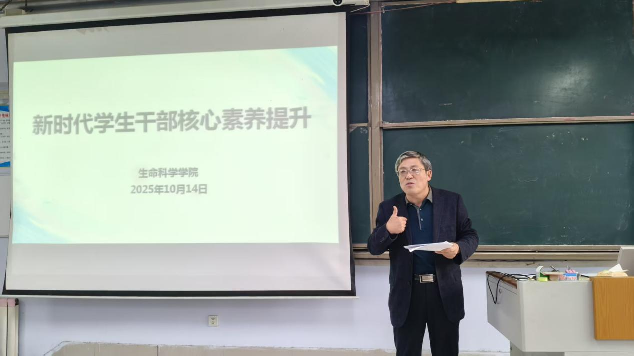 10月14日晚,生命科学学院在求实楼0111教室开展“新时代学生干部核心素养提升”思政课,学院党委书记赵庆福为全体学生会成员上了一堂既有高度又有温度的“成长公开课”。