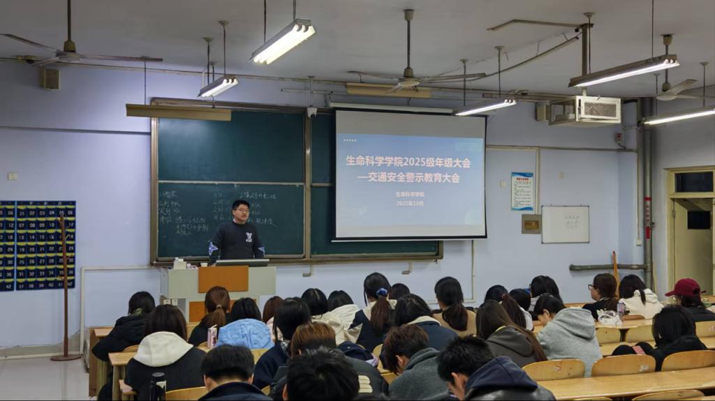 为切实强化学生交通安全防范意识,筑牢校园交通安全防线,10月26日,生命科学学院于求实楼0117、0118教室召开2025级年级大会暨交通安全警示教育大会,本次会议由辅导员李泽老师主讲,2025级全体本科、专升本学生参会。
