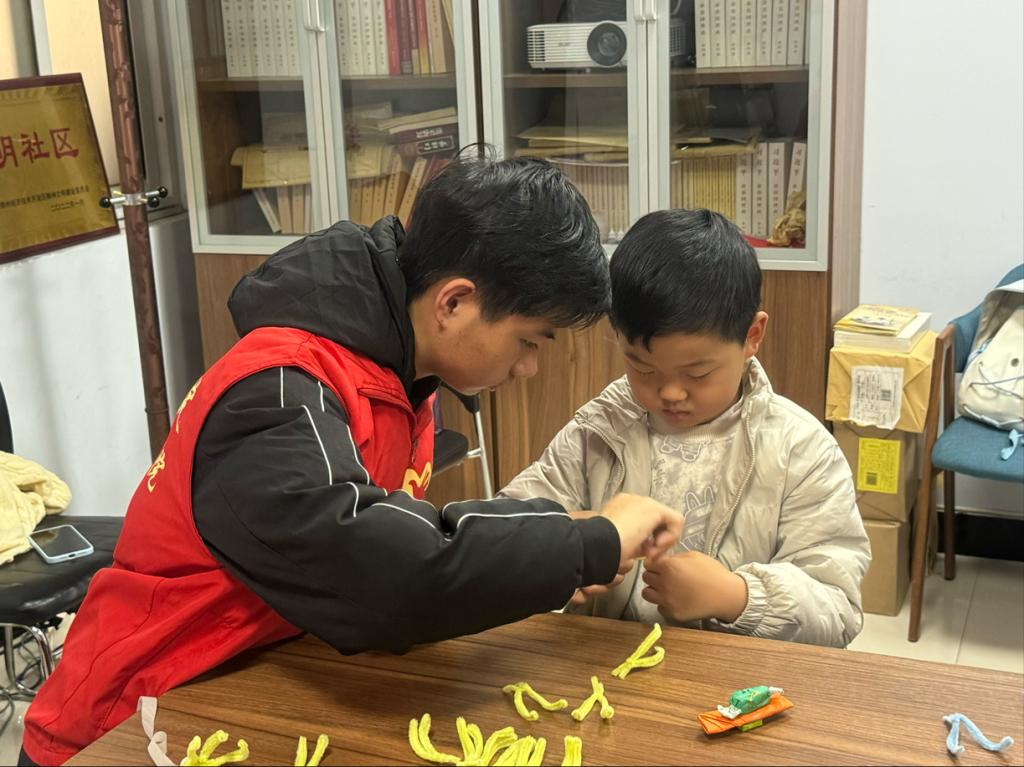 活动现场暖意融融,志愿者们以生动易懂的语言,向小朋友们娓娓道来重阳节“登高赏菊、佩茱萸、敬老祈福”的传统习俗,深入阐释了这一节日在中华传统文化中的重要地位,让孩子们在聆听中感受传统节日的文化底蕴。随后,志愿者们为小朋友们分发扭扭棒、插花棍等手工材料,耐心细致地手把手指导大家构思、塑形,将色彩鲜亮的扭扭棒巧妙弯折、组合,一朵朵形态饱满、活灵活现的手工菊花应运而生。