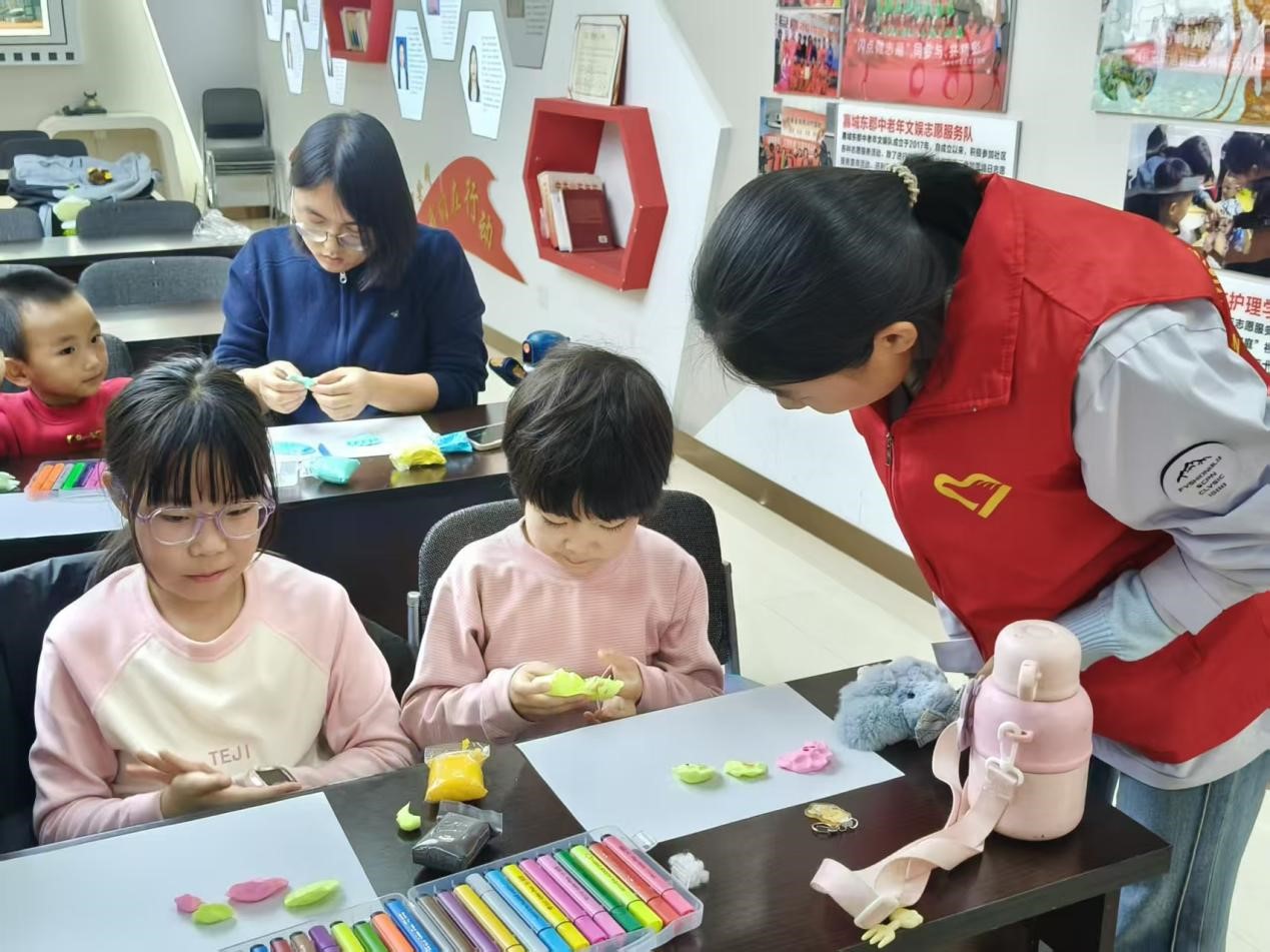活动伊始,志愿者用生动语言向小朋友们介绍立冬的由来,结合卡通图片讲解“水始冰、地始冻”的物候变化。随后,通过问答互动分享立冬习俗,讲述“立冬不端饺子碗,冻掉耳朵没人管”的趣味谚语,带领小朋友们品读浅显易懂的立冬诗词,让孩子们在趣味讲解中加深对传统节气的认知。最后,志愿者分发黏土和画板,引导小朋友们发挥想象,制作色彩鲜艳、造型可爱的黏土饺子画,让孩子们在动手实践中进一步感受立冬习俗的乐趣。