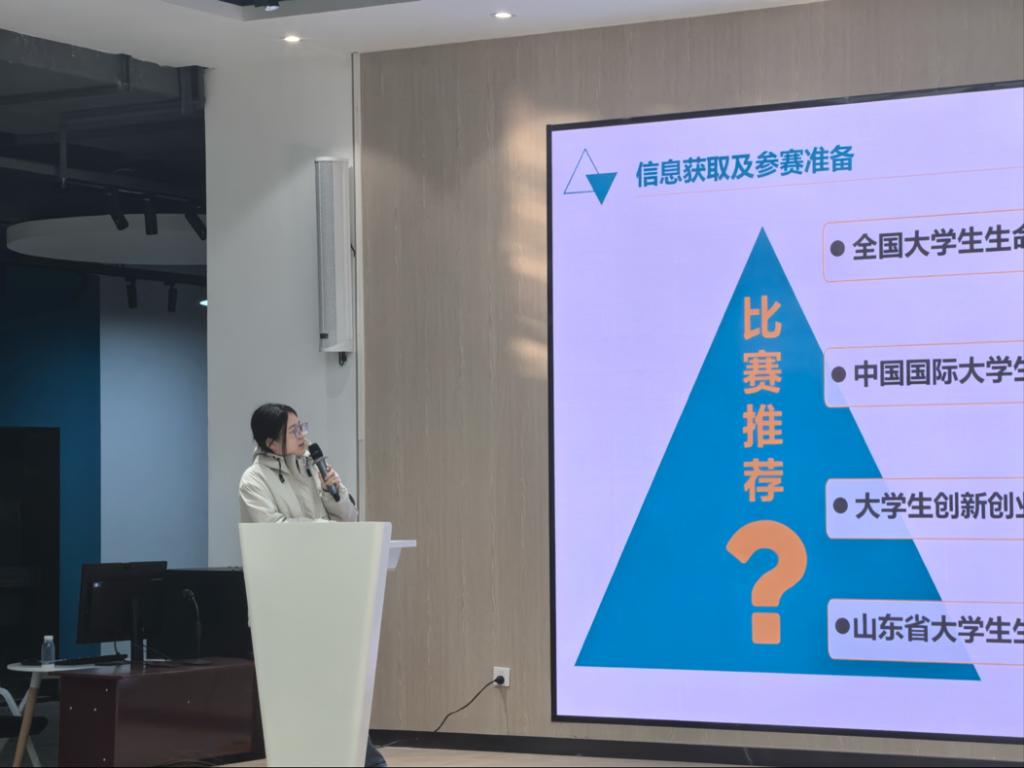 活动中,2023级食品质量与安全专业荣朝曼同学以自身成果为切入点,分享了竞赛与科研融合的实践经验。她围绕论文发表、专利申请及赛事获奖经历,详细讲解了如何依托实验室资源开展重金属离子检测等研究,将科研成果转化为竞赛项目;同时拆解“备赛五步曲”,从信息搜集、团队组建到赛后复盘,为同学们提供了可复制的备赛框架。张一帆同学则聚焦赛事全流程实操,系统介绍了全国大学生生命科学竞赛、中国国际大学生创新大赛等重点赛事的信息获取渠道,梳理了项目书撰写、答辩PPT制作的核心要点,强调实验记录规范、材料提交时效及信息规避等关键注意事项,帮助同学们厘清竞赛筹备细节。