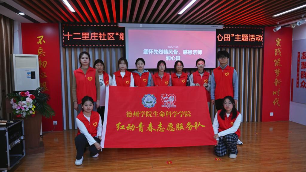 11 月 29 日,生命科学学院红动青春志愿服务队联合十二里庄社区开展“缅怀先烈铸风骨,感恩师亲润心田”主题教育活动,以红色传承与感恩教育为核心,通过多元形式让小朋友传承红色基因、涵养感恩美德,吸引众多亲子家庭参与,现场氛围热烈温馨。