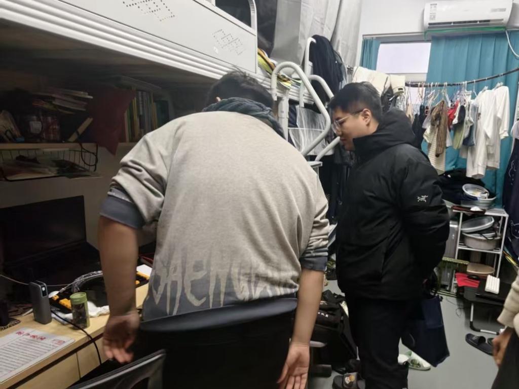 检查过程中,老师们深入每间学生宿舍开展全面细致排查,重点核查电源插座使用、电器设备合规性、电线排布等用电安全,细致查看门窗锁闭、阳台杂物堆放及消防通道畅通情况。针对冬季消防安全高发风险,检查组紧盯违规电器使用、人走未断电、室内吸烟等突出问题,同步结合学风建设要求,引导学生养成规范作息、整洁内务的良好习惯。对排查发现的安全隐患,检查人员现场指出、详实记录,耐心指导学生立行立改,确保隐患清零、落实到位。