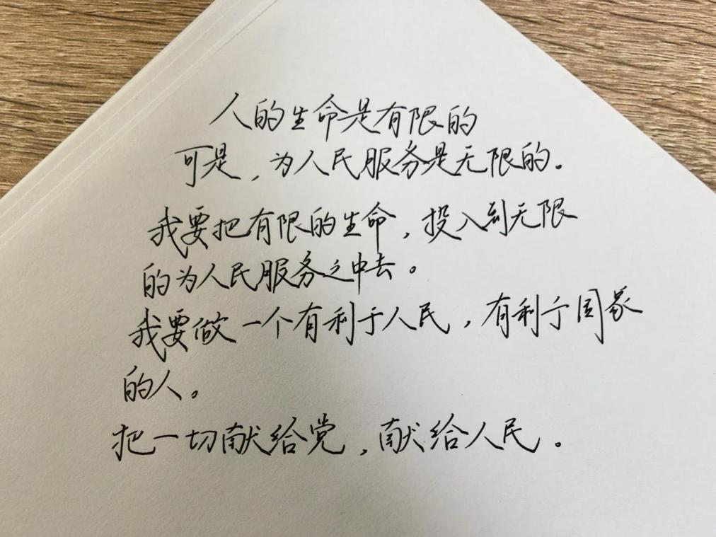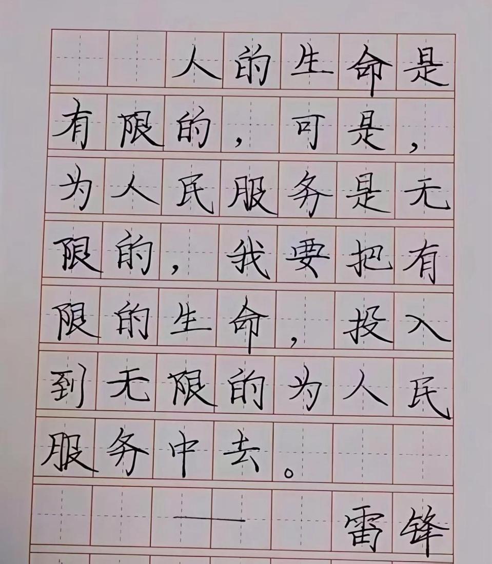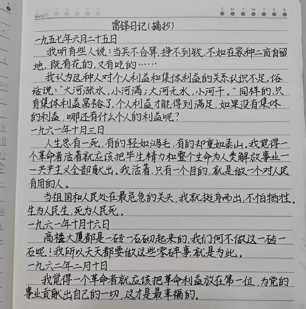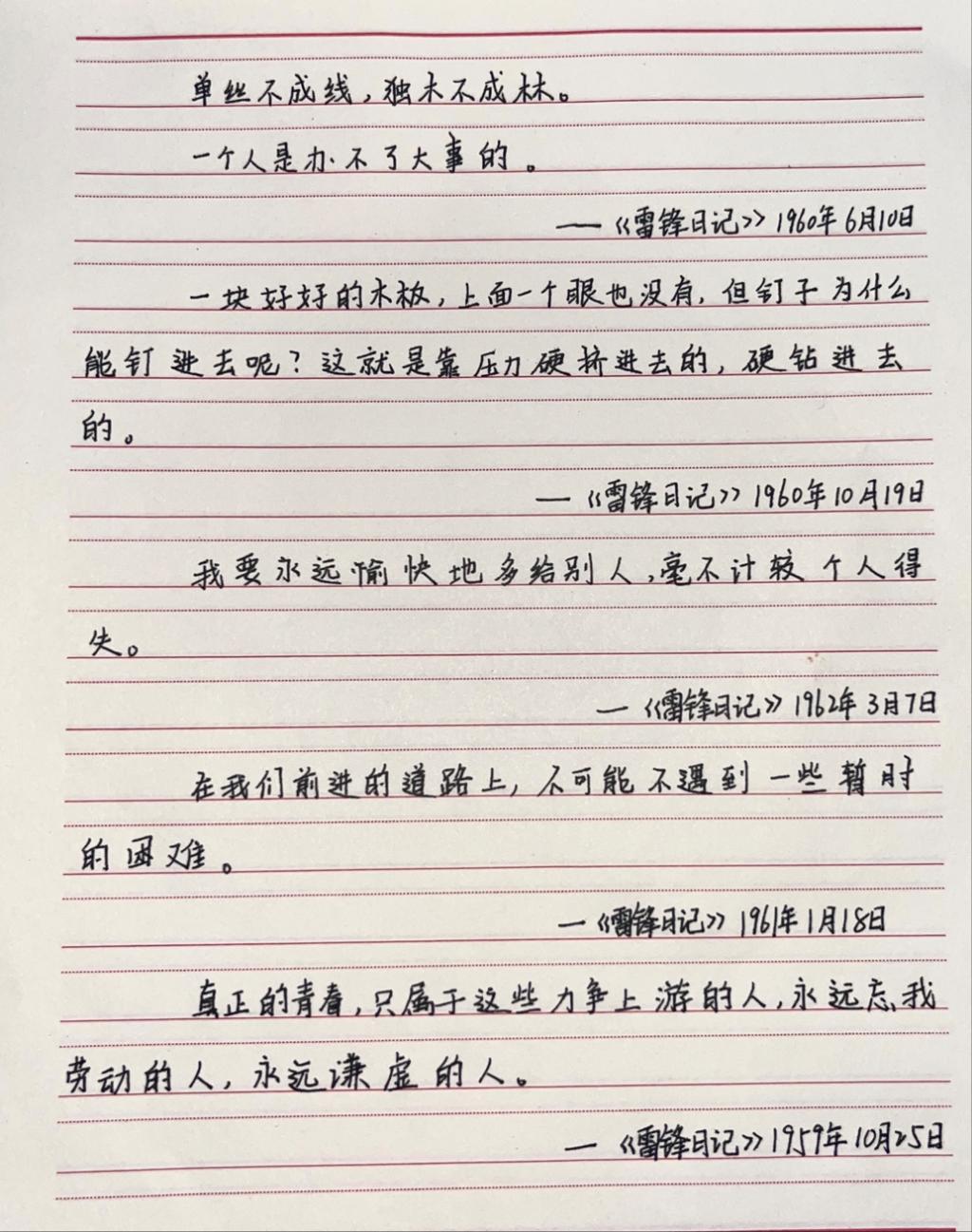 活动中,志愿者提前整理奉献、助人、奋斗、坚守等主题的雷锋经典语录,为大家提供丰富抄写素材。参与者自主选择内容,以硬笔、软笔等形式认真书写,在一笔一画中感悟雷锋精神的深刻内涵,体会榜样的赤诚初心。大家将完成的作品拍照提交,每一份工整真挚的抄写,都承载着对雷锋同志的敬意,彰显着对雷锋精神的传承与践行。志愿者对作品统一整理展示,以笔墨传递温暖,带动更多同学了解雷锋故事、践行雷锋精神。